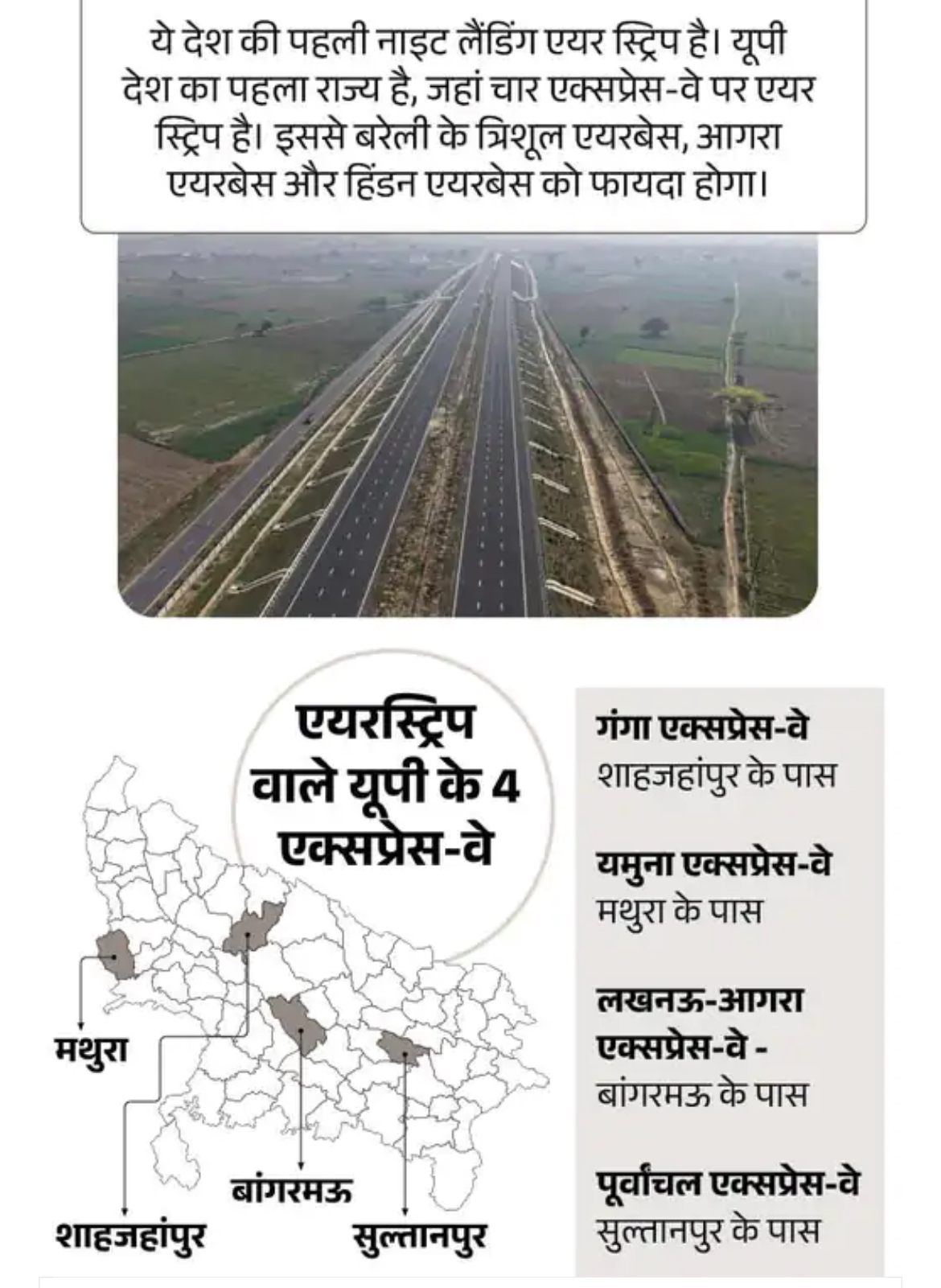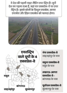 गंगा एक्सप्रेस-वे की एक और बड़ी खासियत यह है कि शाहजहांपुर के जलालाबाद के पास 3.5 किलोमीटर लंबी एयरस्ट्रिप बनाई गई है। यहां भारतीय वायुसेना के फाइटर जेट नाइट लैंडिंग भी कर सकेंगे। यह देश की पहली ऐसी एयरस्ट्रिप मानी जा रही है जहां रात में भी विमान उतर सकते हैं।